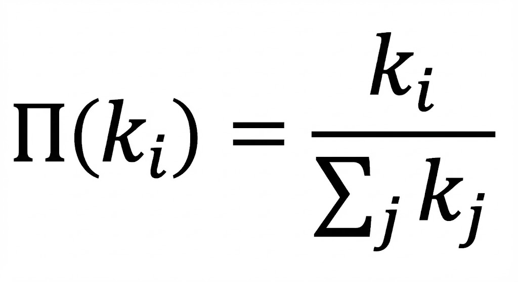 I et netværk styret af Preferential Attachment er sandsynligheden II(Ki) for, at en ny node (bruger) forbinder sig til en eksisterende node “i”, proportional med antallet af forbindelser Ki, som node “i” allerede har: